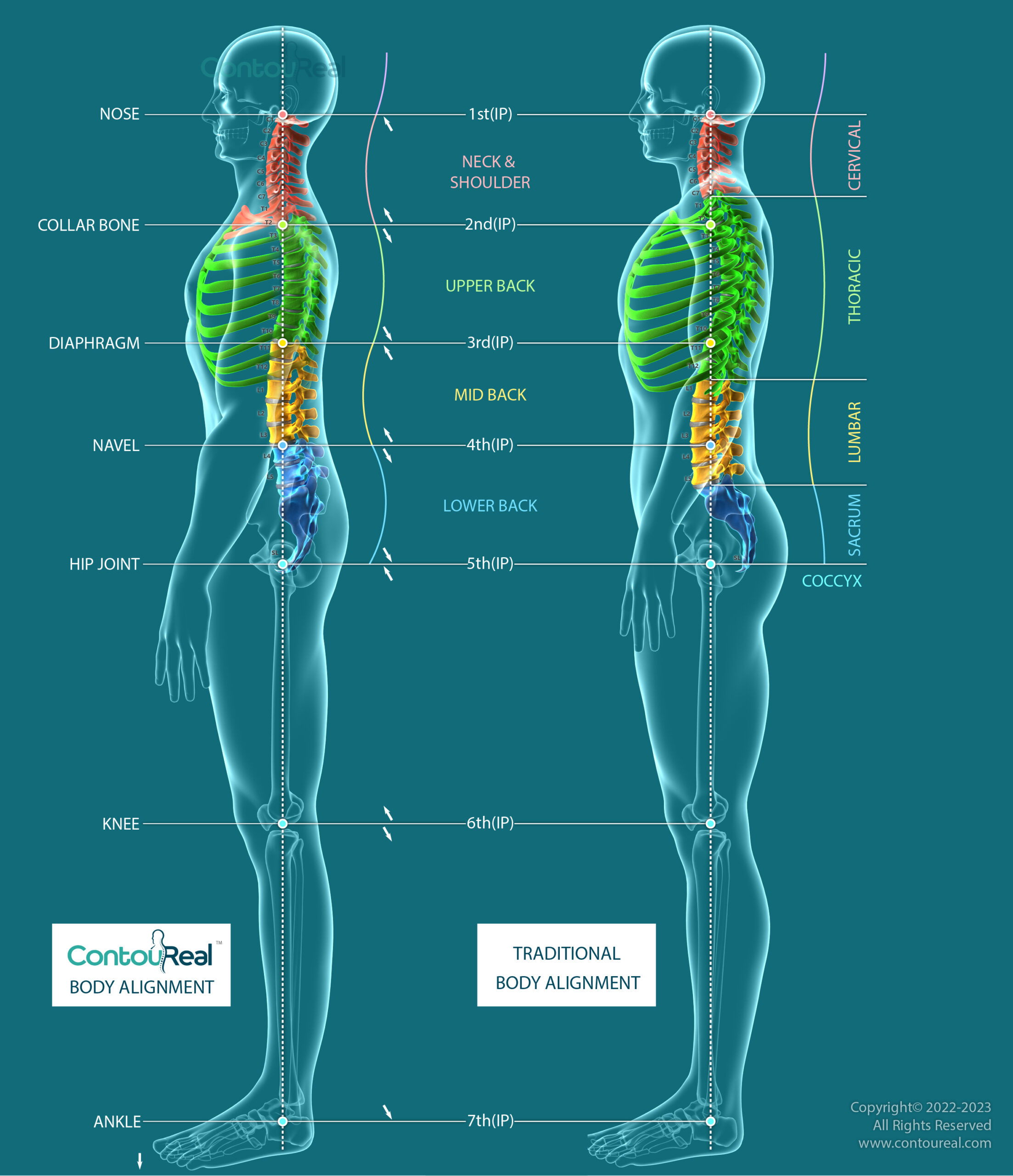 • Connection to Contoureal: The upper support of the Contoureal device is strategically positioned to provide a gentle counter-force to this forward rounding. By placing support at T2/T3, it encourages a subtle extension and decompression at the precise junction that bears the brunt of “tech neck,” facilitating a stretch in the tight pectoral muscles and promoting a more neutral head position.